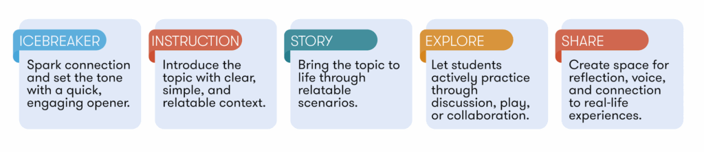 This structure closely mirrors the familiar flow of a Peekapak lesson, making it easy to bring your existing practice into an online space. At the heart of this approach is storytelling as a powerful tool for wellbeing. Just as important is the emphasis on collaboration over lecture. In virtual environments, students learn best when they actively engage with one another rather than passively listen.