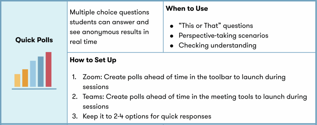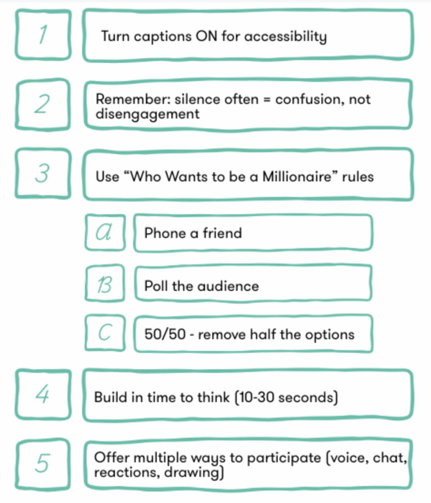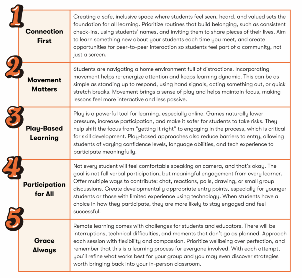 Small adjustments can make a big difference in online learning. These quick, practical strategies help maintain momentum, reduce confusion, and ensure that all students have meaningful ways to participate. All while keeping wellbeing and connection at the center of your lesson!
