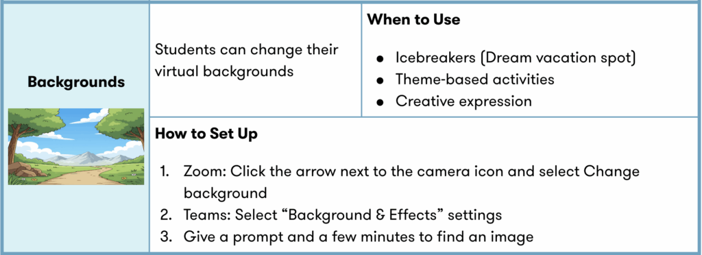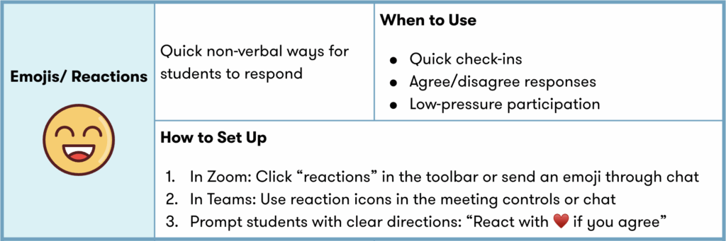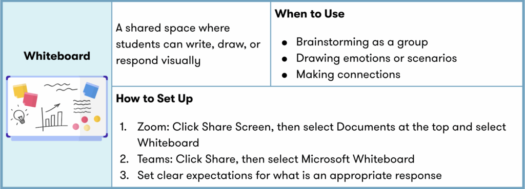 Online platforms like Zoom and Teams offer simple features that can significantly boost engagement when used with intention. From quick reactions to collaborative whiteboards, these tools help turn passive screens into interactive learning spaces, making it easier for students to participate, share, and connect with one another in real time.